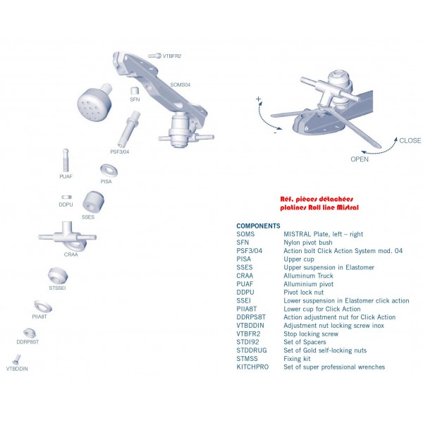 Mistral dotées d'un système de réglage, ponts avec axes acier, suspensions élastomères, fournies avec des butées roll line natural super prof.de rink hockey, écrous et kit de clefs prof. & kit visserie ; ces platines demandent des roulements en 7 mm